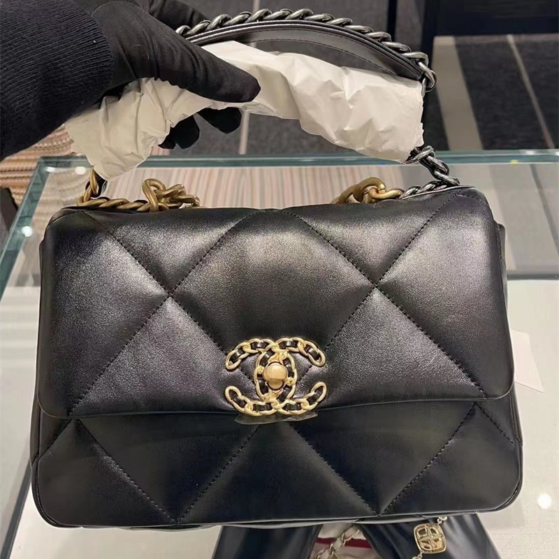 8. CHANEL 19 手袋:老佛爷的遗作,集大成之作。名字源于其诞生年份2019,也致敬香奈儿女士的生日8月19日。超大菱格纹、皮穿链双色肩带、醒目的大号双C转扣,复古又摩登。它的廓形比CF更柔软蓬松,比22更挺括有型,是复古文艺女孩的衣橱必备。