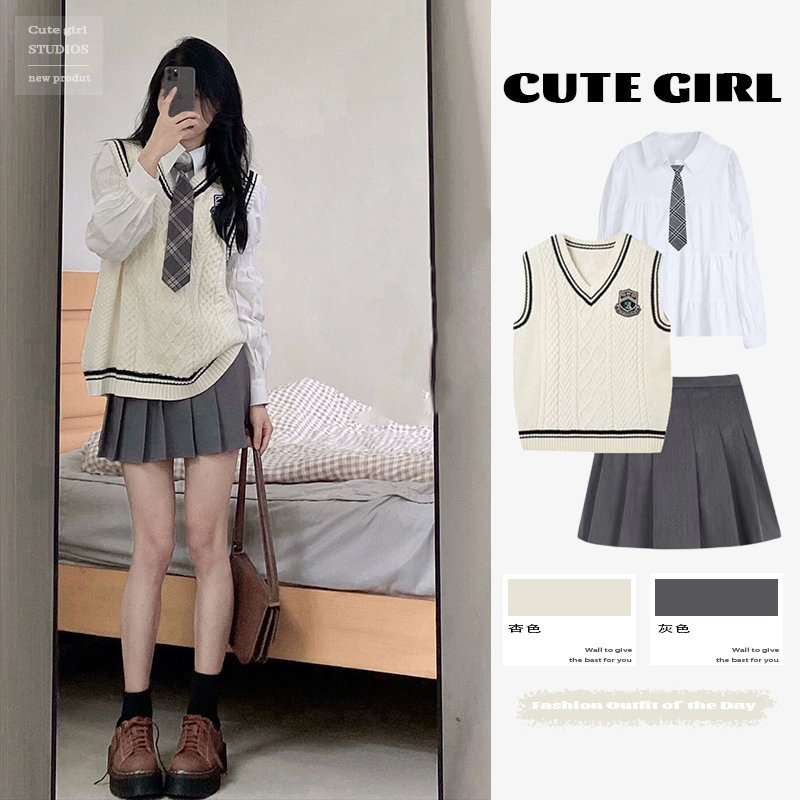女生百褶超短裙搭配针织马甲和乐福鞋